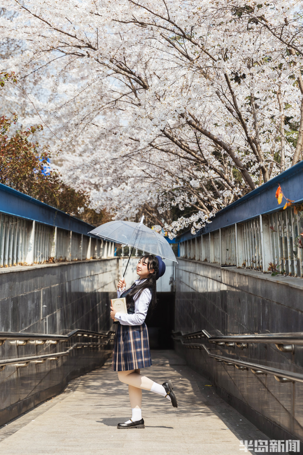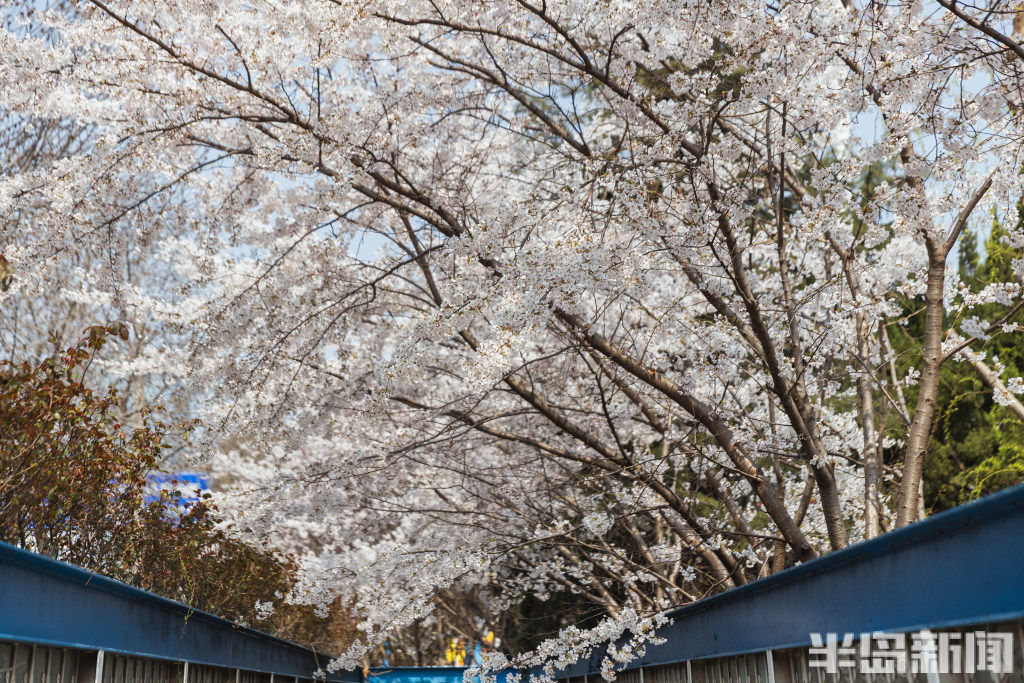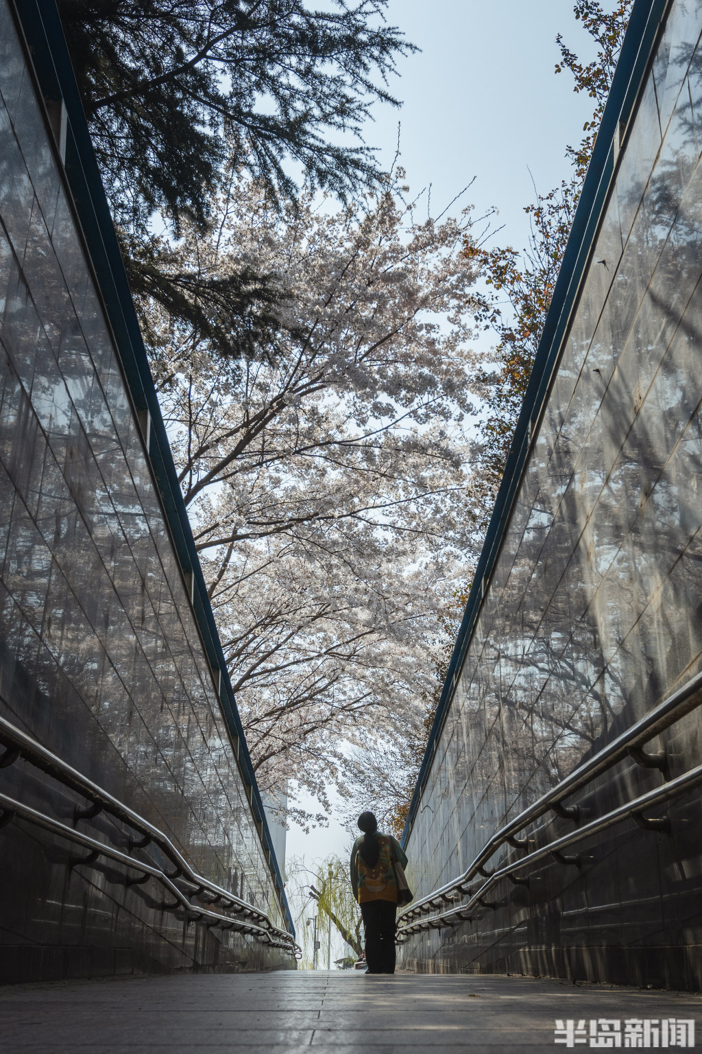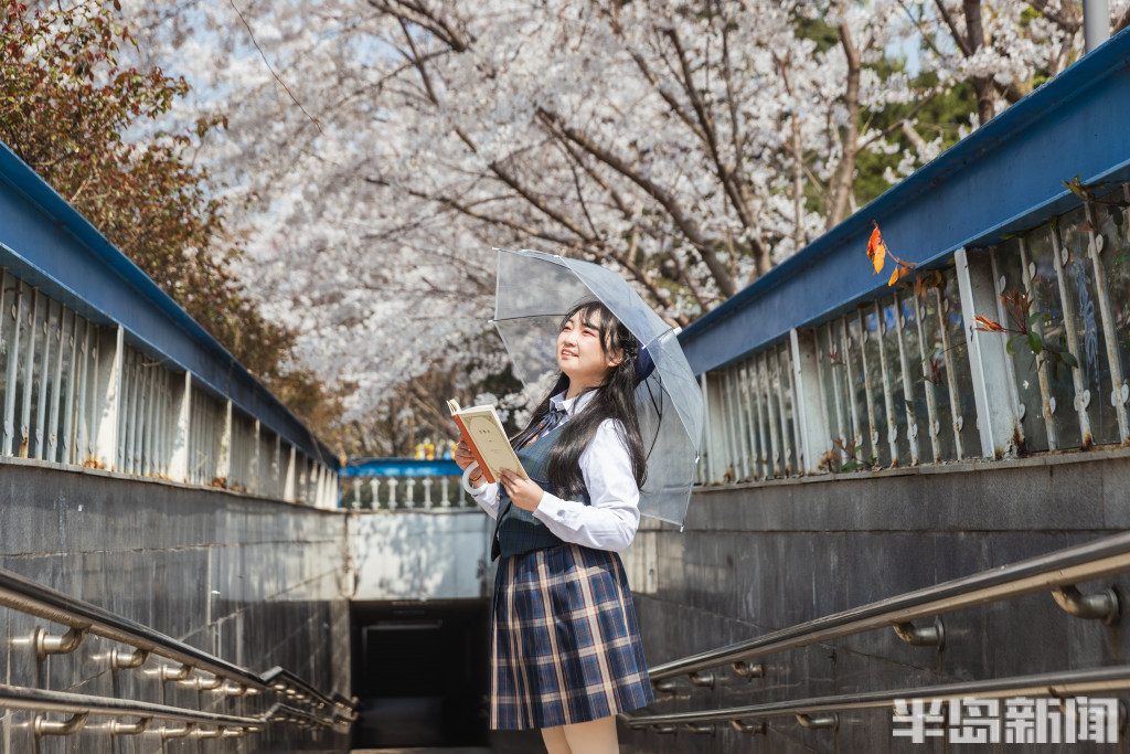 4月2日,青岛市北区海泊河边的一处过街地下通道口,来往行人不住抬头仰望头顶盛开的樱花。与此同时,一些市民专门来此拍照打卡。
