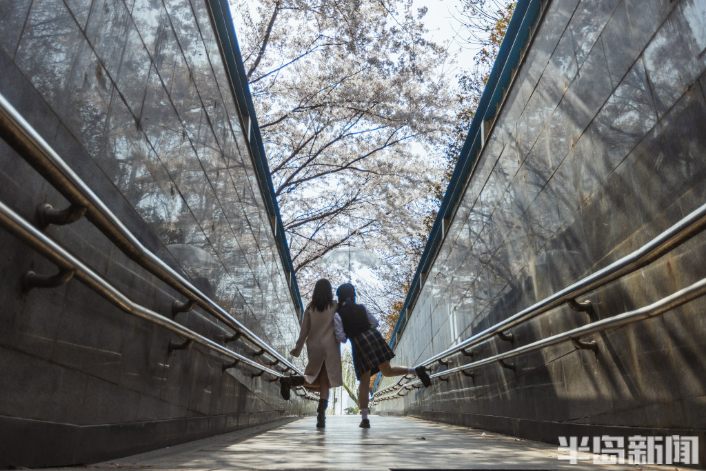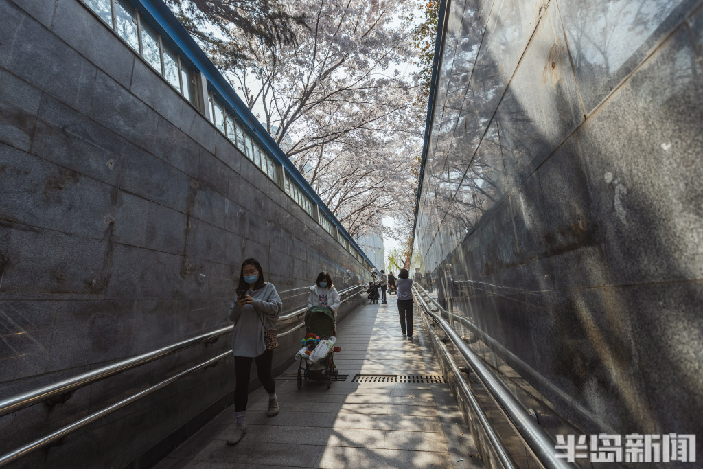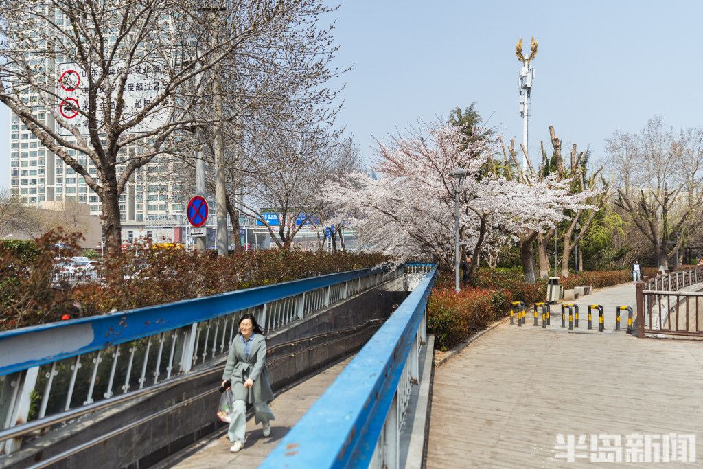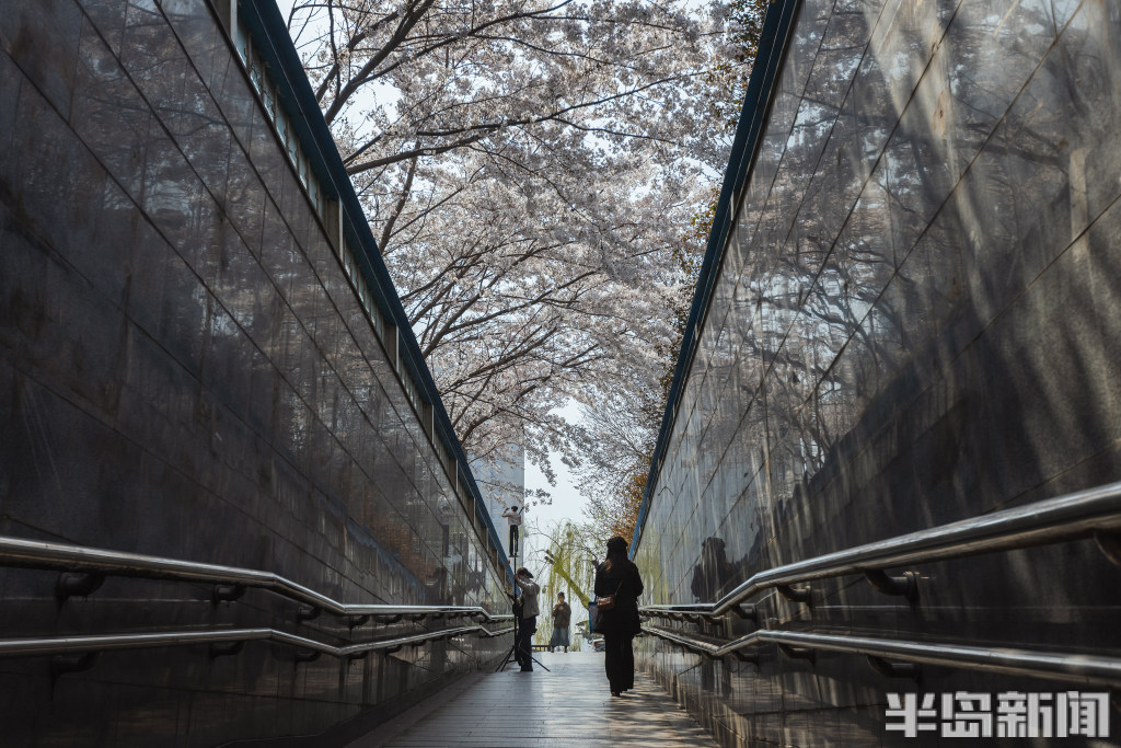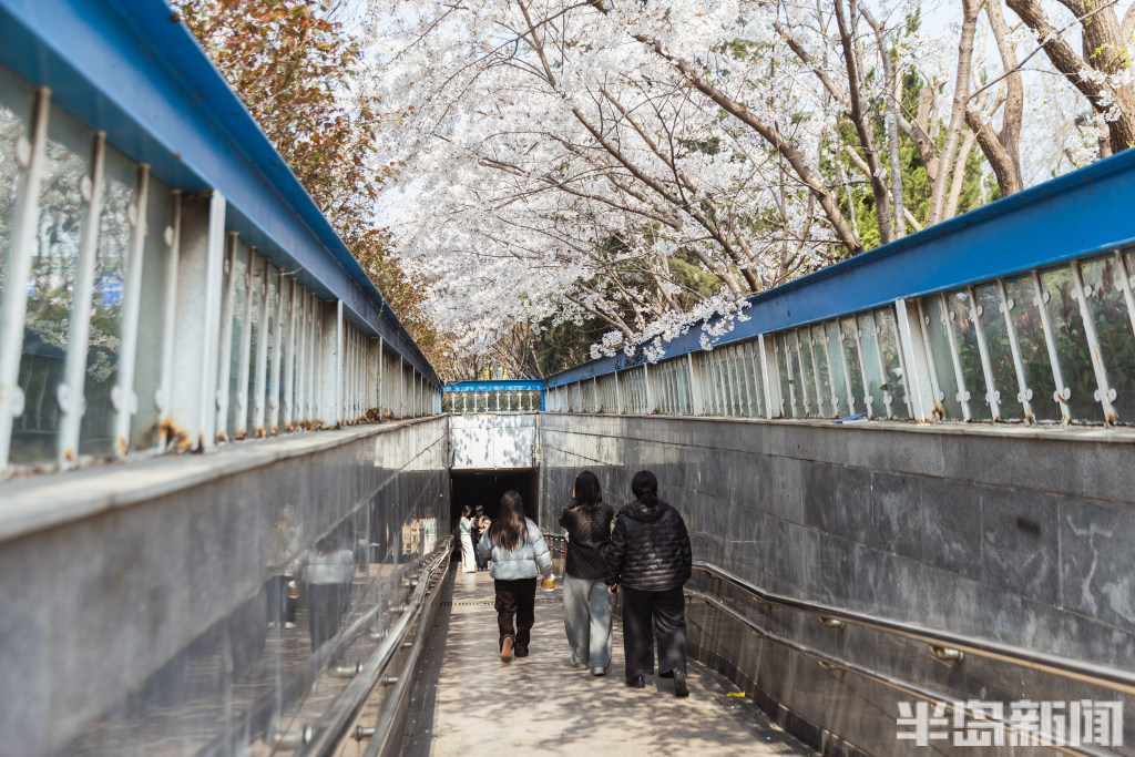 此处地下通道口位于山东路与敦化路交叉口东北侧,平日经常有市民通过该处通道来往于山东路。该通道口外栽种了几株樱花,眼下春日时节,樱花盛开绽放,花枝正好“盖”在了通道口顶部,构成了一道寻常而独特的风景。一些行人纷纷拍下这不期而遇的春意,也有年轻人专门来此拍照打卡。