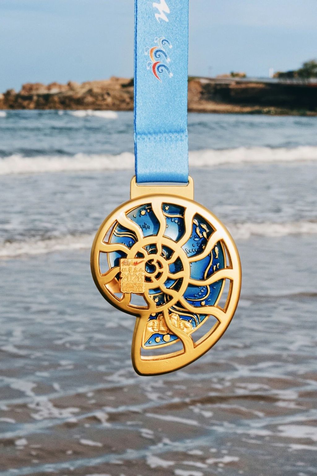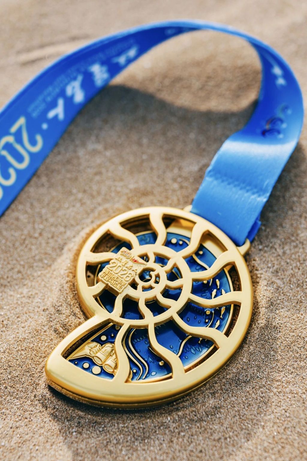 据介绍,本届奖牌以西海岸新区海螺为核心造型,巧妙融入浪花、“青岛・世界”标识与山茶花元素,既深深呼应西海岸的海洋基因,又点缀出这座城市独有的浪漫氛围。奖牌形似数字“9”,不仅呼应了今年是举办该赛事的第九年,同时致敬前八届赛事沉淀的厚重底蕴,更以“螺旋向上”的灵动意象,礼赞跑者挑战自我、永不止步的奔跑初心。