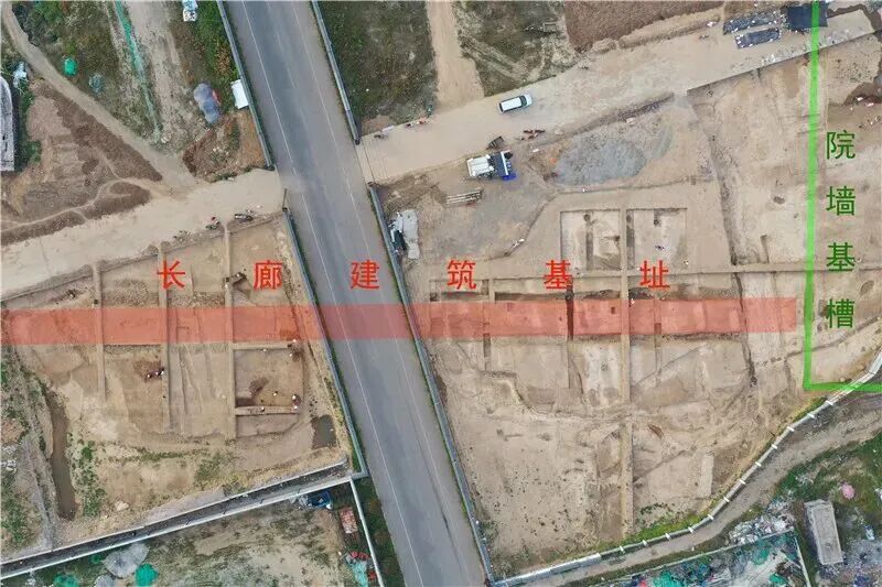房间和天井位于不同层级台面上,由台基壁面与夯土墙围合构成,均发现门道。房间外接檐廊,室内墙壁贴砖,地面设长方形石砌地漏;天井形制相近,亦发现排水口。基址东北部发现院落门址,门内外分别铺有散水和慢道。西南部发现登台踏步,部分砖面饰龙纹。